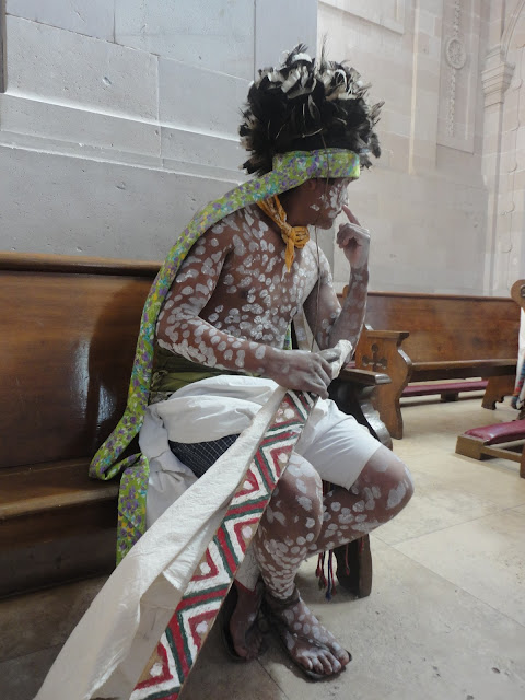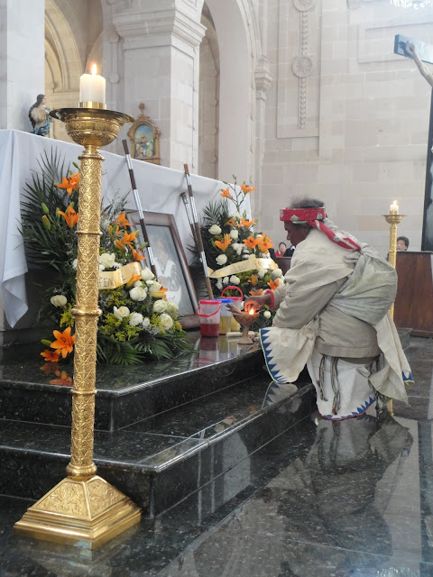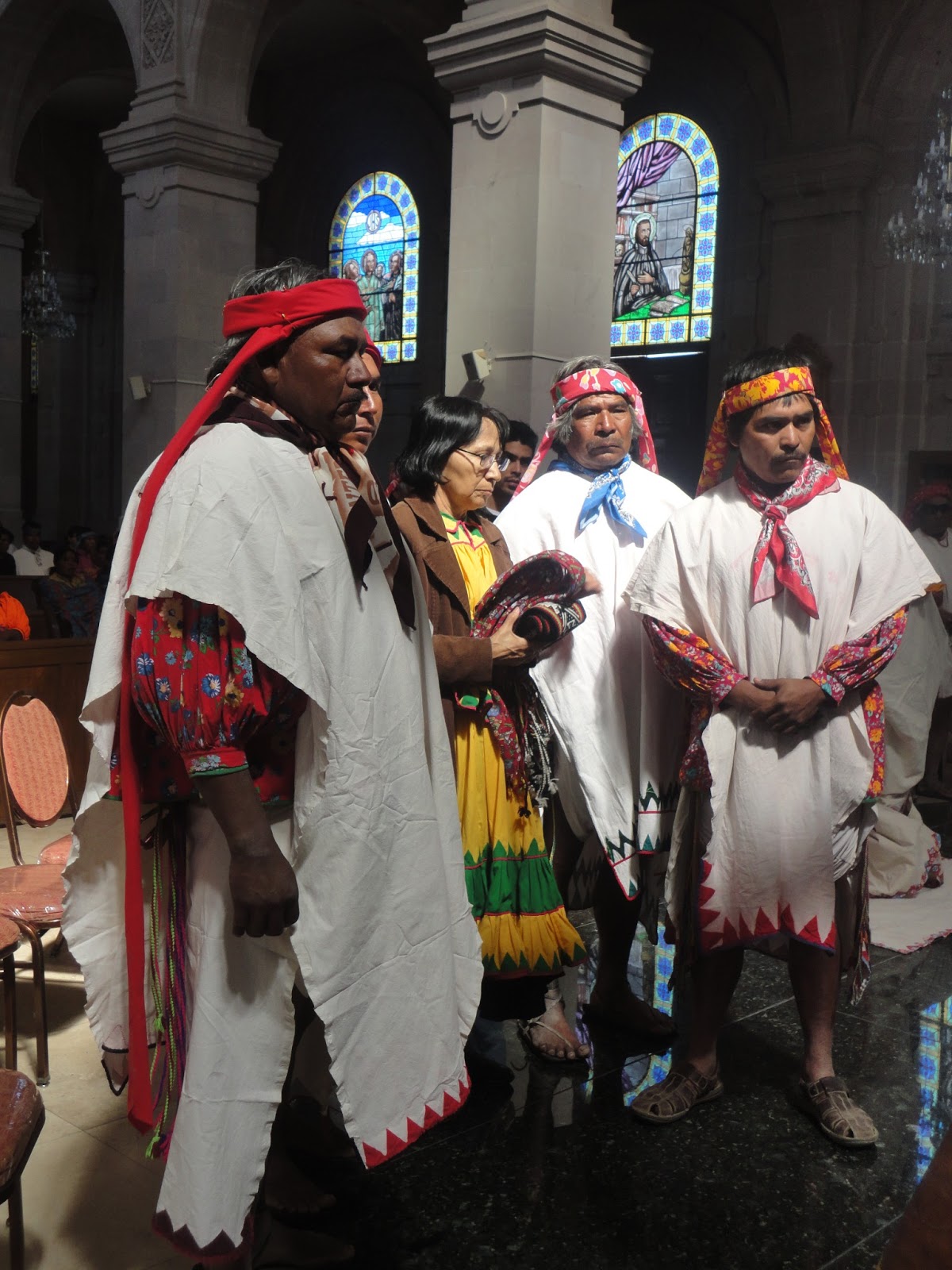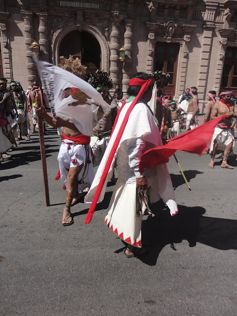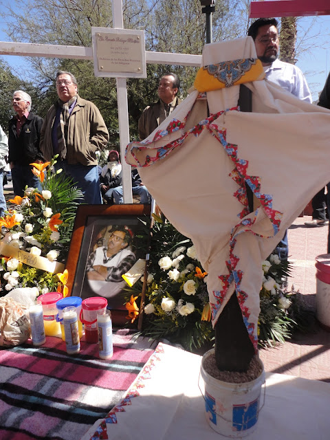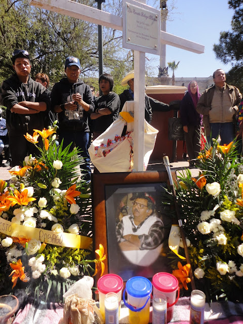Continuando con la marcha hacia la Plaza Hidalgo, frente al Palacio de Gobierno, exigiendo justicia a las autoridades para esclarecimiento del crimen; llevando a cabo la danza de matachines y fariseos que es realizada de manera tradicional durante la Semana Santa en la zona de Baquéachi y otras comunidades indígenas.