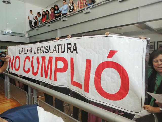 No estuvo a la altura para reformar la Ley Electoral de fondo, un ejemplo, en cuanto a la paridad y las excepciones, se tuvo que recurrir a litigio ante tribunal para defender los derechos políticos de las ciudadanas. Nosotras /os como colectivo de defensoras/es de derechos humanos que hoy presentamos el balance, fuimos quienes logramos mediante la presentación de un Juicio de Protección de Derechos Político Electorales de los Ciudadanos, ante el Tribunal Electoral del Poder Judicial de la Federación, para revertir lo establecido en los Lineamientos y Criterios para el registro de Candidatos a Diputados, Miembros del Ayuntamiento y Síndicos, para el proceso electoral 2013. ESTÁN REPROBADOS