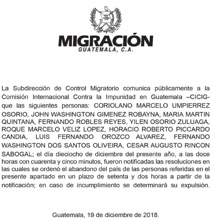 El día 19 de diciembre, el Instituto Guatemalteco de Migración publicó en el Diario de Centro América un aviso en el que señala que el día 18 habían sido notificadas “las resoluciones en las cuales se ordenó el abandono del país de las personas referidas en el presente apartado en un plazo de setenta y dos horas a partir de la notificación; en caso de incumplimiento se determinará su expulsión”.