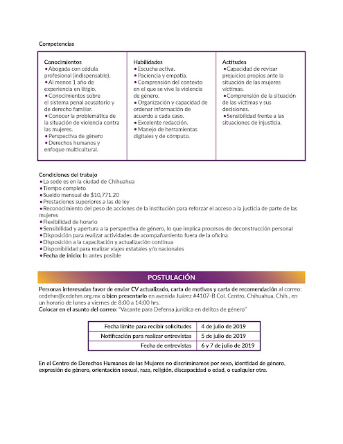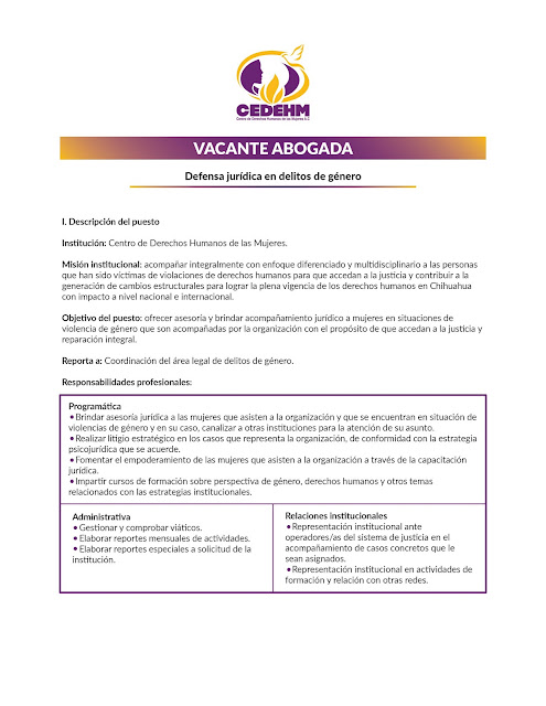 [email protected] o bien presentarlo en avenida Juárez #4107-B Col. Centro, Chihuahua, Chih., en un horario de lunes a viernes de 8:00 a 14:00 hrs. Colocar en el asunto del correo: “Vacante para Defensa jurídica en delitos de género”.