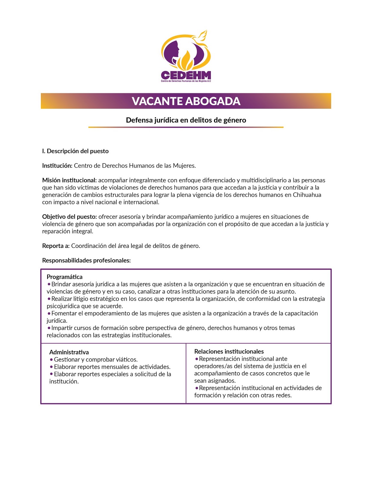 Objetivo del puesto: ofrecer asesoría y brindar acompañamiento jurídico a mujeres en situaciones de violencia de género que son acompañadas por la organización con el propósito de que accedan a la justicia y reparación integral.